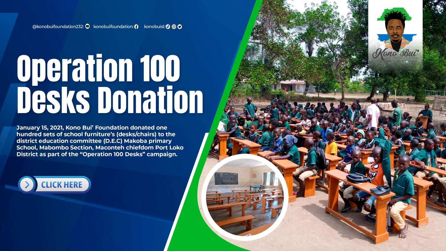 January 15, 2021, Kono Bui Foundation donated one hundred sets of school furniture’s (desks/chairs) to the district education committee (D.E.C) Makoba Primary School, Mabombo Section, Maconteh chiefdom Port Loko District as part of the “Operation 100 Desks” campaign.